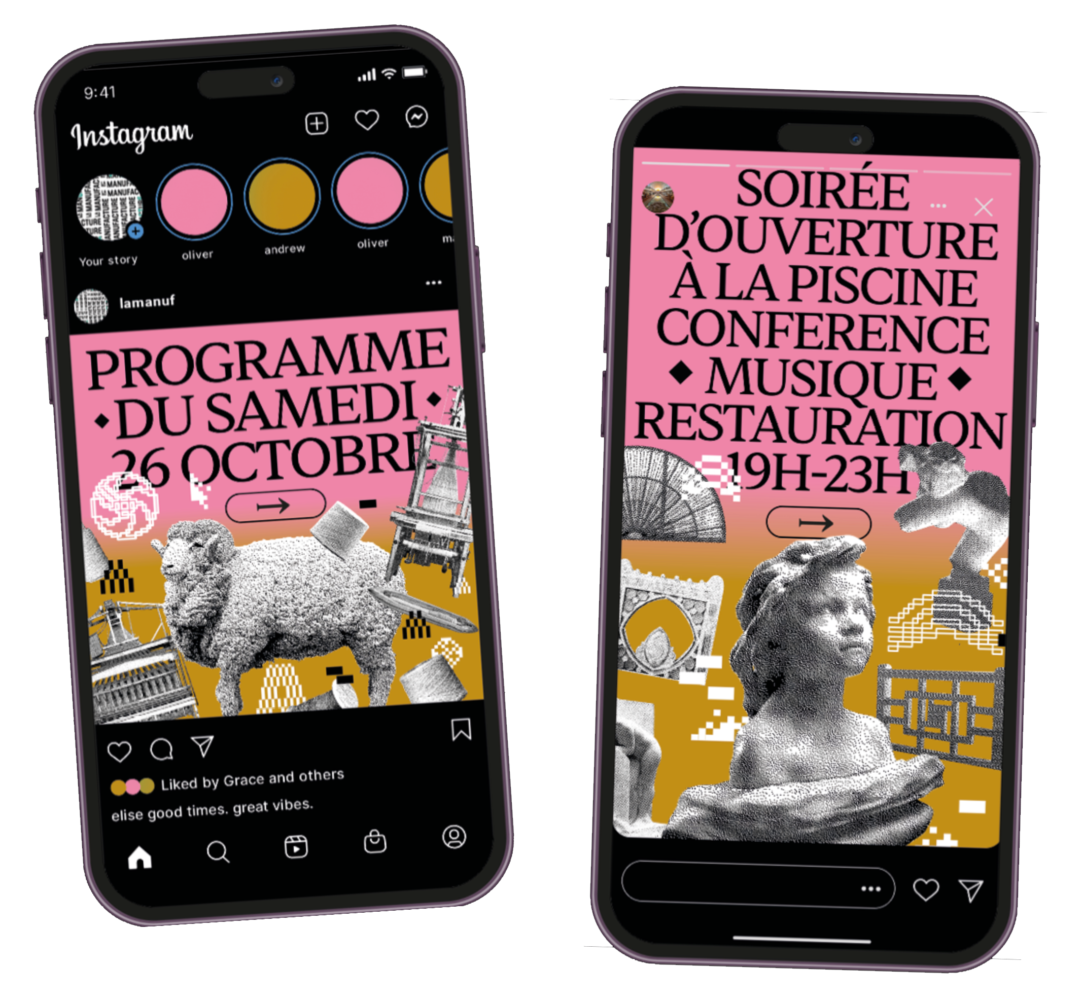 compositions s'unissent pour évoquer un patrimoine vivant. Le rose et le doré, la typographie inspirée de la